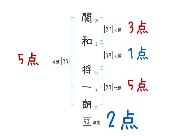 天運![]() | 関和将一朗さんの天運は27画の3つ星!頭脳明晰だが強情で摩擦が多い傾向。孤立に注意。 家系が持つ宿命的な運勢を表します。祖先から受け継いだ苗字ですので自分の力が及びません。家柄を象徴します。 |