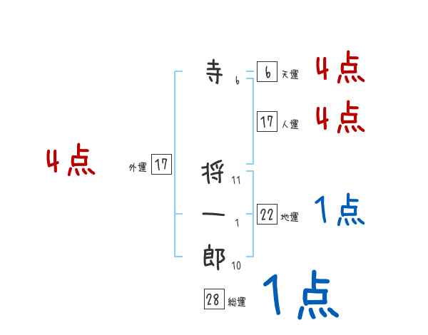 外運![]() | 寺将一郎さんの外運は17画の4つ星!積極的な行動力。地位を気づき財産を手に入れる。純粋な心と直感力。 生活面を象徴する運勢です。外部から受ける影響力を表し、結婚運、家庭運や職場、環境への順応性を表します。 |