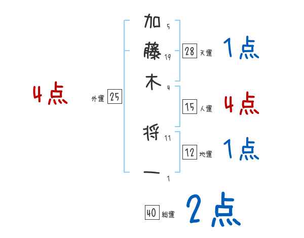 天運![]() | 加藤木将一さんの天運は28画の1つ星!家庭環境に注意。スポーツで活躍できる能力があるかも。 家系が持つ宿命的な運勢を表します。祖先から受け継いだ苗字ですので自分の力が及びません。家柄を象徴します。 |