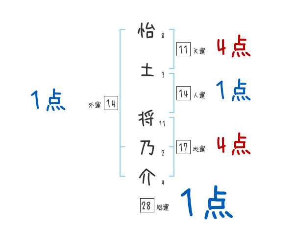 総運![]() | 怡土将乃介さんの総運は28画の1つ星!家庭環境に注意。スポーツで活躍できる能力があるかも。 あなたの人生を表す1番重要な運勢です。生涯を通じて影響する総合運となり、主に50歳以降の晩年期に影響を及ぼします。 |