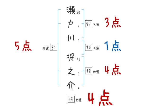 総運![]() | 瀬戸川将之介さんの総運は45画の4つ星!もくもくと物事を進め達成する。地味な努力家。 あなたの人生を表す1番重要な運勢です。生涯を通じて影響する総合運となり、主に50歳以降の晩年期に影響を及ぼします。 |