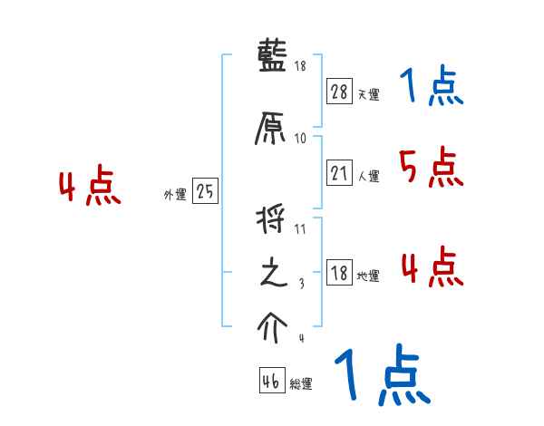 天運![]() | 藍原将之介さんの天運は28画の1つ星!家庭環境に注意。スポーツで活躍できる能力があるかも。 家系が持つ宿命的な運勢を表します。祖先から受け継いだ苗字ですので自分の力が及びません。家柄を象徴します。 |