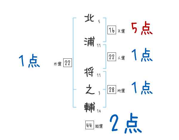 総運![]() | 北浦将之輔さんの総運は44画の2つ星!誠実で慎重な性格。物事を考えすぎないように注意しましょう。 あなたの人生を表す1番重要な運勢です。生涯を通じて影響する総合運となり、主に50歳以降の晩年期に影響を及ぼします。 |