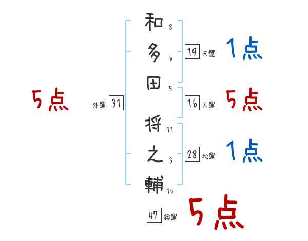 総運![]() | 和多田将之輔さんの総運は47画の5つ星!実力が開花し発展する円満な人生。財に恵まれる。 あなたの人生を表す1番重要な運勢です。生涯を通じて影響する総合運となり、主に50歳以降の晩年期に影響を及ぼします。 |