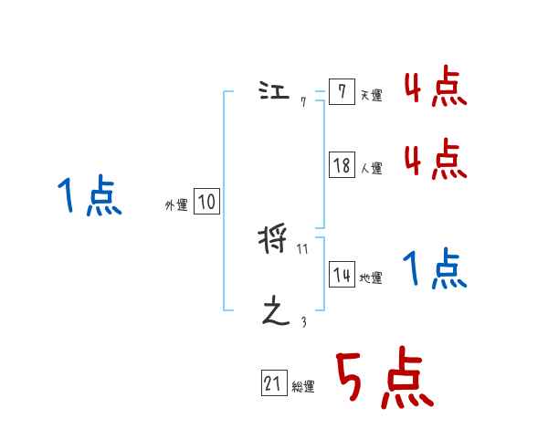 天運![]() | 江将之さんの天運は7画の4つ星!強い意志や信念を持ち独立心が強い。自立する。 家系が持つ宿命的な運勢を表します。祖先から受け継いだ苗字ですので自分の力が及びません。家柄を象徴します。 |