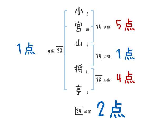 総運![]() | 小宮山将亨さんの総運は34画の2つ星!独創性に優れるが、自尊心が強く災難に注意しましょう。 あなたの人生を表す1番重要な運勢です。生涯を通じて影響する総合運となり、主に50歳以降の晩年期に影響を及ぼします。 |