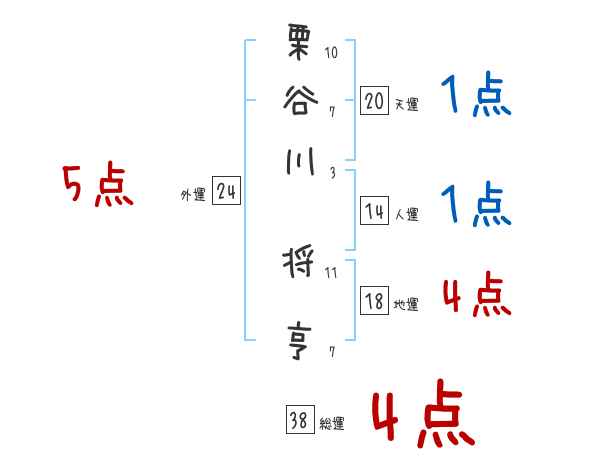 外運![]() | 栗谷川将亨さんの外運は24画の5つ星!家庭運が良く順調な人生。金運にも恵まれる。 生活面を象徴する運勢です。外部から受ける影響力を表し、結婚運、家庭運や職場、環境への順応性を表します。 |