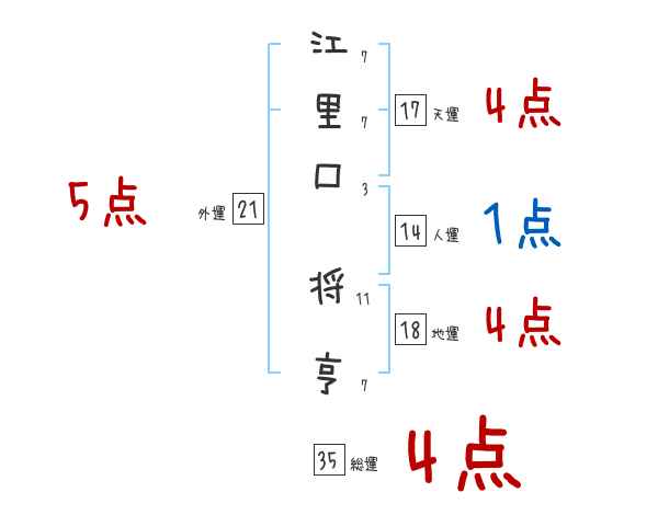 外運![]() | 江里口将亨さんの外運は21画の5つ星!統率力がある。独立し成功する。名誉を手に入れる。 生活面を象徴する運勢です。外部から受ける影響力を表し、結婚運、家庭運や職場、環境への順応性を表します。 |