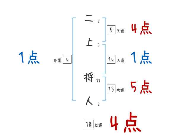天運![]() | 二上将人さんの天運は5画の4つ星!健康で安泰。協調性に優れ、財産に恵まれる。 家系が持つ宿命的な運勢を表します。祖先から受け継いだ苗字ですので自分の力が及びません。家柄を象徴します。 |