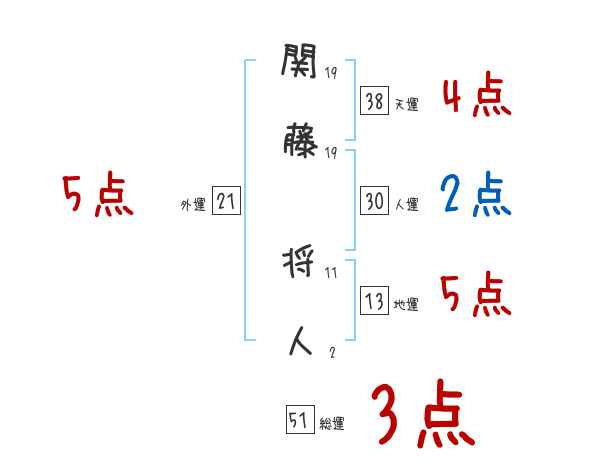 天運![]() | 関藤将人さんの天運は38画の4つ星!温厚な性格で技術的な才能を発揮する。職人的な仕事に向いている。 家系が持つ宿命的な運勢を表します。祖先から受け継いだ苗字ですので自分の力が及びません。家柄を象徴します。 |