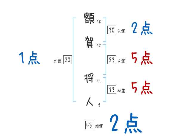 天運![]() | 額賀将人さんの天運は30画の2つ星!浮き沈みの激しさに注意しましょう。 家系が持つ宿命的な運勢を表します。祖先から受け継いだ苗字ですので自分の力が及びません。家柄を象徴します。 |