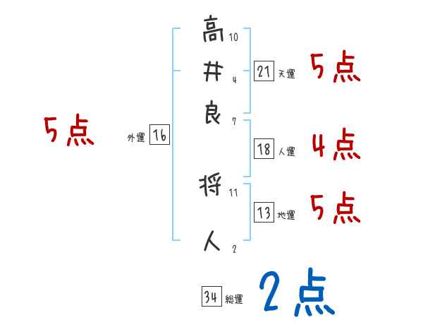 外運![]() | 高井良将人さんの外運は16画の5つ星!人望が厚く大きく発展する。逆転成功が見える。 生活面を象徴する運勢です。外部から受ける影響力を表し、結婚運、家庭運や職場、環境への順応性を表します。 |