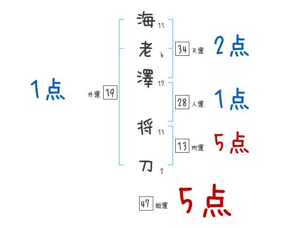 総運![]() | 海老澤将刀さんの総運は47画の5つ星!実力が開花し発展する円満な人生。財に恵まれる。 あなたの人生を表す1番重要な運勢です。生涯を通じて影響する総合運となり、主に50歳以降の晩年期に影響を及ぼします。 |