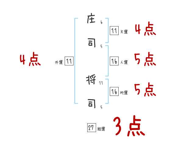 天運![]() | 庄司将司さんの天運は11画の4つ星!着実に富や地位を得る幸運な人生。 家系が持つ宿命的な運勢を表します。祖先から受け継いだ苗字ですので自分の力が及びません。家柄を象徴します。 |
