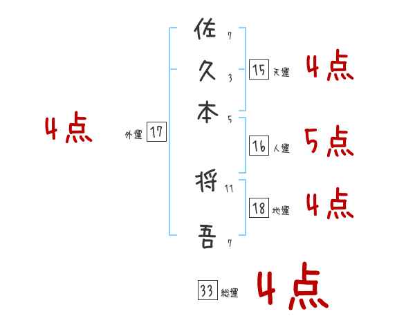 外運![]() | 佐久本将吾さんの外運は17画の4つ星!積極的な行動力。地位を気づき財産を手に入れる。純粋な心と直感力。 生活面を象徴する運勢です。外部から受ける影響力を表し、結婚運、家庭運や職場、環境への順応性を表します。 |