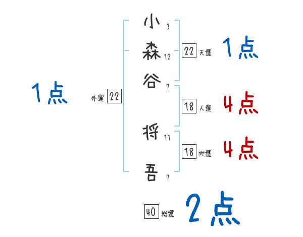 外運![]() | 小森谷将吾さんの外運は22画の1つ星!努力することが苦手ないっぽう手先が器用。芸術性にも優れる。 生活面を象徴する運勢です。外部から受ける影響力を表し、結婚運、家庭運や職場、環境への順応性を表します。 |