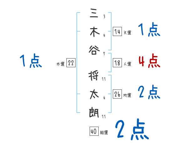 人運![]() | 三木谷将太朗さんの人運は18画の4つ星!情熱的で剛気。忍耐力があり信頼される。 性格や才能などを表す2番目に重要な運勢です。人間関係や協調性、社会的な成功に影響します。主に20歳から50歳ぐらいまでの中年期の運勢を表します。 |