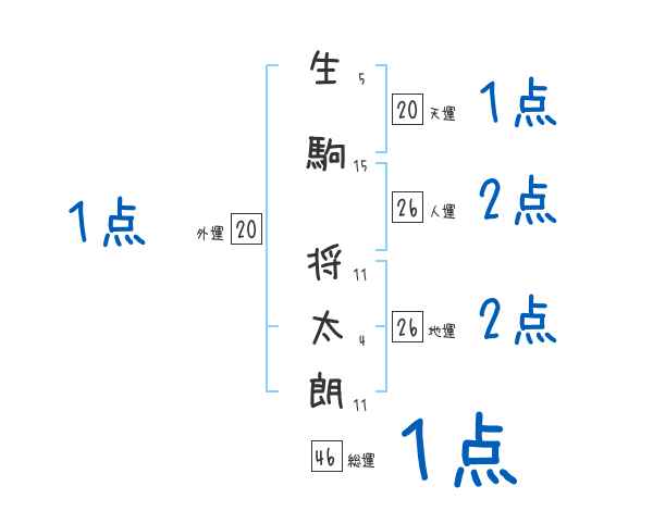 総運![]() | 生駒将太朗さんの総運は46画の1つ星!迷走することが多く苦労するかも。目先のことにとらわれないように。 あなたの人生を表す1番重要な運勢です。生涯を通じて影響する総合運となり、主に50歳以降の晩年期に影響を及ぼします。 |