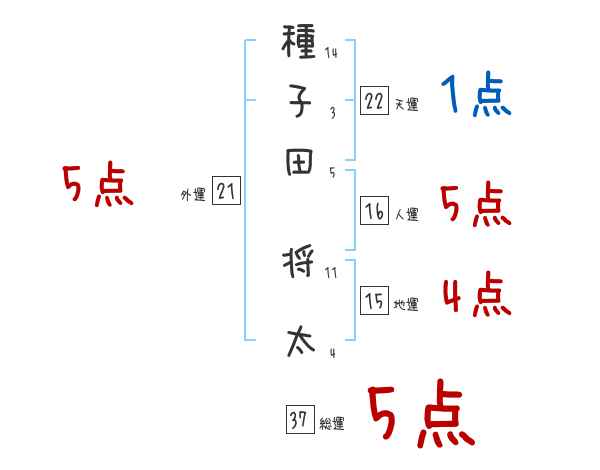 人運![]() | 種子田将太さんの人運は16画の5つ星!人望が厚く大きく発展する。逆転成功が見える。 性格や才能などを表す2番目に重要な運勢です。人間関係や協調性、社会的な成功に影響します。主に20歳から50歳ぐらいまでの中年期の運勢を表します。 |