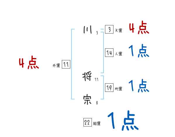 天運![]() | 川将宗さんの天運は3画の4つ星!活動的で才能に恵まれ、多くの信頼を得る。希望に満ち成長する。 家系が持つ宿命的な運勢を表します。祖先から受け継いだ苗字ですので自分の力が及びません。家柄を象徴します。 |