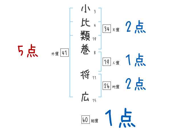 人運![]() | 小比類巻将広さんの人運は19画の1つ星!優れた才能を持ちますが、協調性が足りないことも。周りの人と協力する事を意識しましょう。 性格や才能などを表す2番目に重要な運勢です。人間関係や協調性、社会的な成功に影響します。主に20歳から50歳ぐらいまでの中年期の運勢を表します。 |