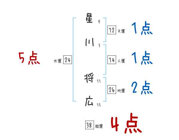 外運![]() | 星川将広さんの外運は24画の5つ星!家庭運が良く順調な人生。金運にも恵まれる。 生活面を象徴する運勢です。外部から受ける影響力を表し、結婚運、家庭運や職場、環境への順応性を表します。 |