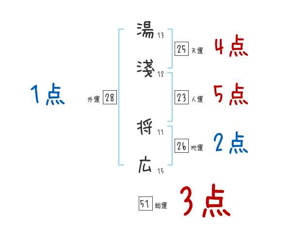 人運![]() | 湯淺将広さんの人運は23画の5つ星!想像力に優れ活力がある。一代で成功し名誉を手に入れる。 性格や才能などを表す2番目に重要な運勢です。人間関係や協調性、社会的な成功に影響します。主に20歳から50歳ぐらいまでの中年期の運勢を表します。 |
