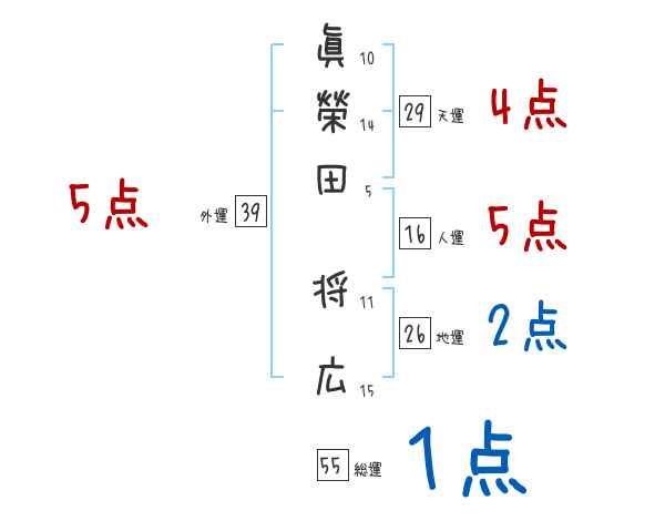 外運![]() | 眞榮田将広さんの外運は39画の5つ星!社交性に優れ人望が厚い。人の上に立ち成功する。 生活面を象徴する運勢です。外部から受ける影響力を表し、結婚運、家庭運や職場、環境への順応性を表します。 |