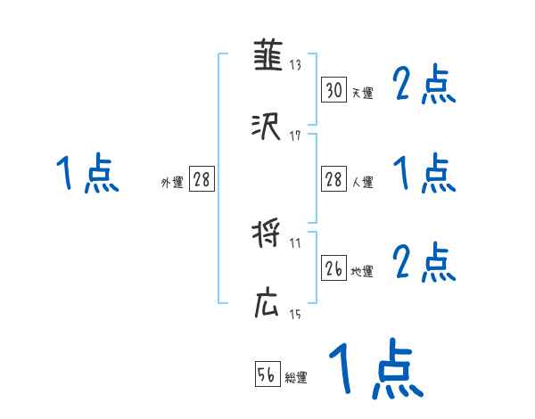 外運![]() | 韮沢将広さんの外運は28画の1つ星!家庭環境に注意。スポーツで活躍できる能力があるかも。 生活面を象徴する運勢です。外部から受ける影響力を表し、結婚運、家庭運や職場、環境への順応性を表します。 |