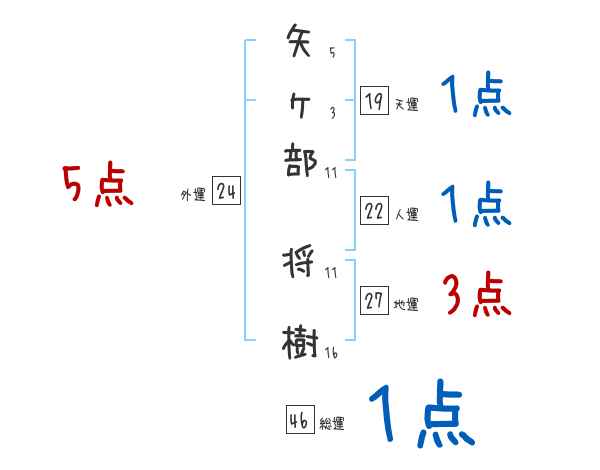 外運![]() | 矢ヶ部将樹さんの外運は24画の5つ星!家庭運が良く順調な人生。金運にも恵まれる。 生活面を象徴する運勢です。外部から受ける影響力を表し、結婚運、家庭運や職場、環境への順応性を表します。 |