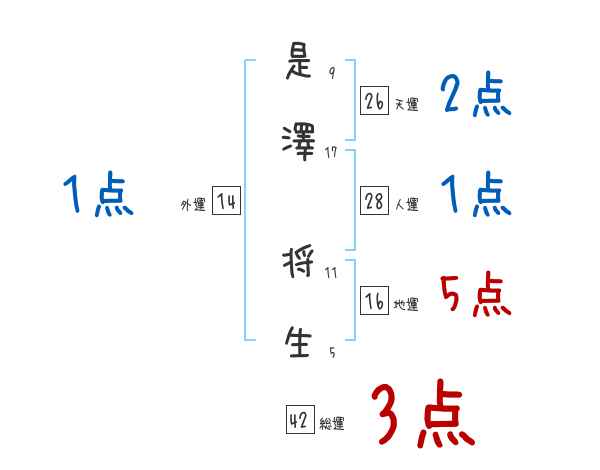 地運![]() | 是澤将生さんの地運は16画の5つ星!人望が厚く大きく発展する。逆転成功が見える。 個性を表す基礎的な運勢です。性格形成や対人関係、行動力など家庭環境に影響されます。主に誕生してから20歳くらいまでの若年期の運勢を表します。 |