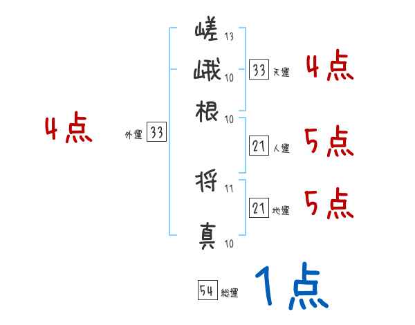 外運![]() | 嵯峨根将真さんの外運は33画の4つ星!権力志向でプライドが高い。勇気があり運を切り開き成功する。 生活面を象徴する運勢です。外部から受ける影響力を表し、結婚運、家庭運や職場、環境への順応性を表します。 |