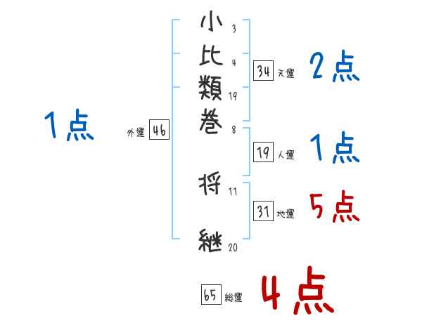人運![]() | 小比類巻将継さんの人運は19画の1つ星!優れた才能を持ちますが、協調性が足りないことも。周りの人と協力する事を意識しましょう。 性格や才能などを表す2番目に重要な運勢です。人間関係や協調性、社会的な成功に影響します。主に20歳から50歳ぐらいまでの中年期の運勢を表します。 |