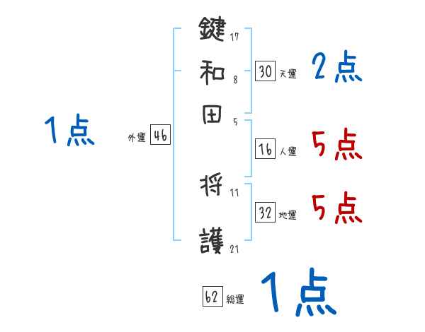 人運![]() | 鍵和田将護さんの人運は16画の5つ星!人望が厚く大きく発展する。逆転成功が見える。 性格や才能などを表す2番目に重要な運勢です。人間関係や協調性、社会的な成功に影響します。主に20歳から50歳ぐらいまでの中年期の運勢を表します。 |