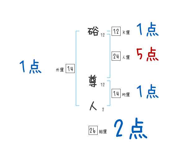外運![]() | 硲尊人さんの外運は14画の1つ星!人に対して優しいがストレスを溜め込みがち。人間関係のトラブルを避けるよう気をつけましょう。 生活面を象徴する運勢です。外部から受ける影響力を表し、結婚運、家庭運や職場、環境への順応性を表します。 |