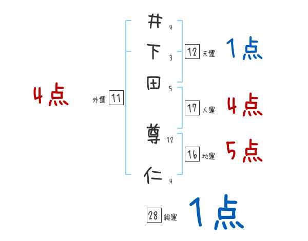 総運![]() | 井下田尊仁さんの総運は28画の1つ星!家庭環境に注意。スポーツで活躍できる能力があるかも。 あなたの人生を表す1番重要な運勢です。生涯を通じて影響する総合運となり、主に50歳以降の晩年期に影響を及ぼします。 |