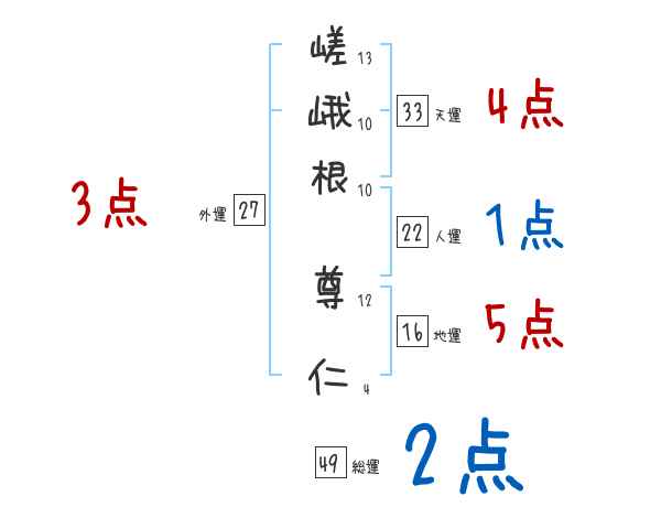 天運![]() | 嵯峨根尊仁さんの天運は33画の4つ星!権力志向でプライドが高い。勇気があり運を切り開き成功する。 家系が持つ宿命的な運勢を表します。祖先から受け継いだ苗字ですので自分の力が及びません。家柄を象徴します。 |