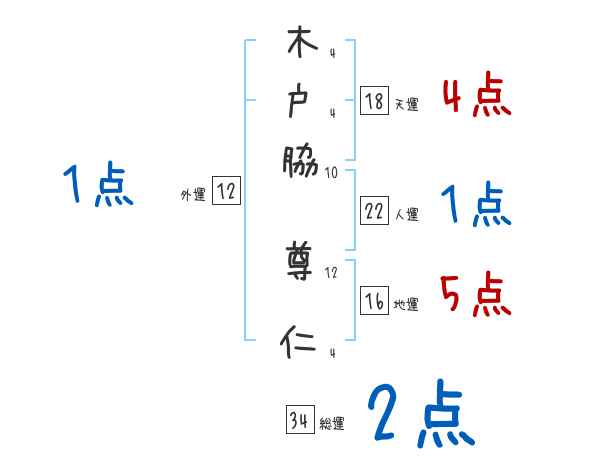 総運![]() | 木戸脇尊仁さんの総運は34画の2つ星!独創性に優れるが、自尊心が強く災難に注意しましょう。 あなたの人生を表す1番重要な運勢です。生涯を通じて影響する総合運となり、主に50歳以降の晩年期に影響を及ぼします。 |