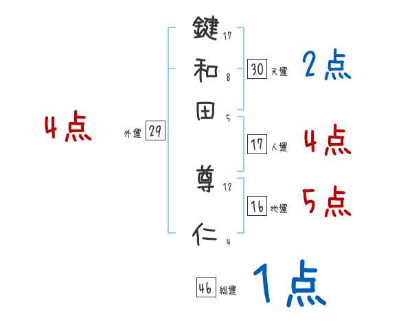 天運![]() | 鍵和田尊仁さんの天運は30画の2つ星!浮き沈みの激しさに注意しましょう。 家系が持つ宿命的な運勢を表します。祖先から受け継いだ苗字ですので自分の力が及びません。家柄を象徴します。 |