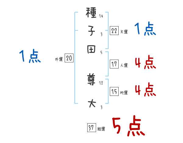 天運![]() | 種子田尊大さんの天運は22画の1つ星!努力することが苦手ないっぽう手先が器用。芸術性にも優れる。 家系が持つ宿命的な運勢を表します。祖先から受け継いだ苗字ですので自分の力が及びません。家柄を象徴します。 |