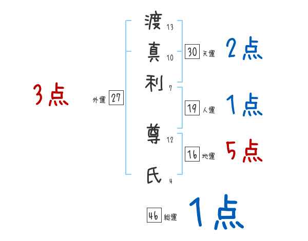 天運![]() | 渡真利尊氏さんの天運は30画の2つ星!浮き沈みの激しさに注意しましょう。 家系が持つ宿命的な運勢を表します。祖先から受け継いだ苗字ですので自分の力が及びません。家柄を象徴します。 |