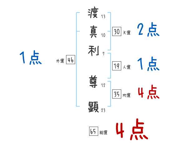 天運![]() | 渡真利尊顕さんの天運は30画の2つ星!浮き沈みの激しさに注意しましょう。 家系が持つ宿命的な運勢を表します。祖先から受け継いだ苗字ですので自分の力が及びません。家柄を象徴します。 |