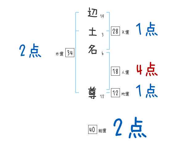 天運![]() | 辺土名尊さんの天運は28画の1つ星!家庭環境に注意。スポーツで活躍できる能力があるかも。 家系が持つ宿命的な運勢を表します。祖先から受け継いだ苗字ですので自分の力が及びません。家柄を象徴します。 |