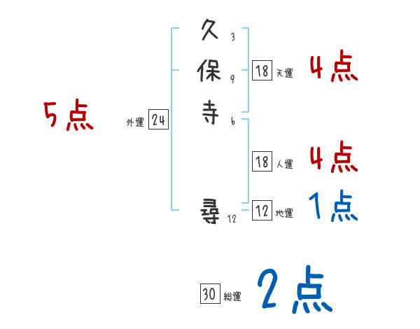 天運![]() | 久保寺尋さんの天運は18画の4つ星!情熱的で剛気。忍耐力があり信頼される。 家系が持つ宿命的な運勢を表します。祖先から受け継いだ苗字ですので自分の力が及びません。家柄を象徴します。 |