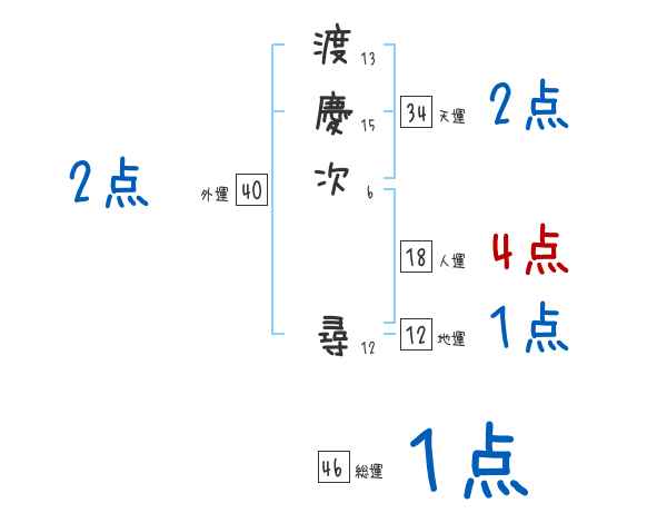 総運![]() | 渡慶次尋さんの総運は46画の1つ星!迷走することが多く苦労するかも。目先のことにとらわれないように。 あなたの人生を表す1番重要な運勢です。生涯を通じて影響する総合運となり、主に50歳以降の晩年期に影響を及ぼします。 |