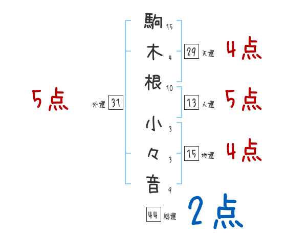 総運![]() | 駒木根小々音さんの総運は44画の2つ星!誠実で慎重な性格。物事を考えすぎないように注意しましょう。 あなたの人生を表す1番重要な運勢です。生涯を通じて影響する総合運となり、主に50歳以降の晩年期に影響を及ぼします。 |