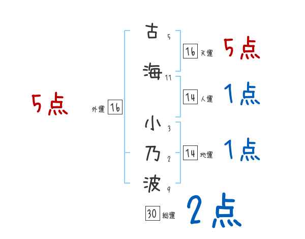 天運![]() | 古海小乃波さんの天運は16画の5つ星!人望が厚く大きく発展する。逆転成功が見える。 家系が持つ宿命的な運勢を表します。祖先から受け継いだ苗字ですので自分の力が及びません。家柄を象徴します。 |
