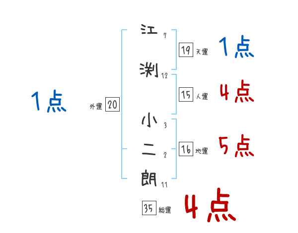 地運![]() | 江渕小二朗さんの地運は16画の5つ星!人望が厚く大きく発展する。逆転成功が見える。 個性を表す基礎的な運勢です。性格形成や対人関係、行動力など家庭環境に影響されます。主に誕生してから20歳くらいまでの若年期の運勢を表します。 |