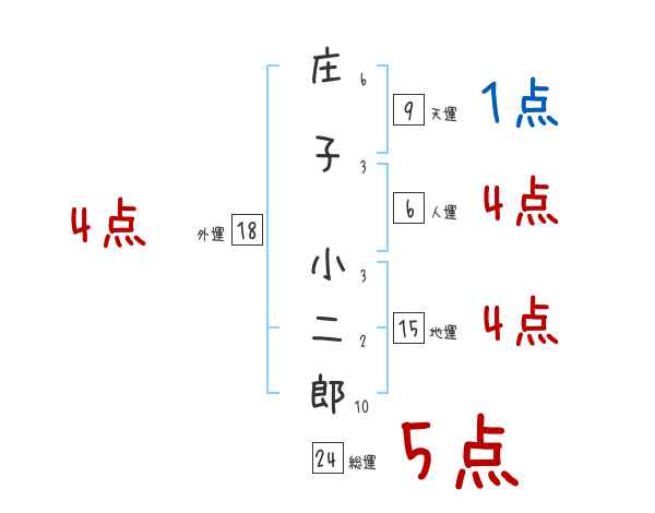 天運![]() | 庄子小二郎さんの天運は9画の1つ星!消極的で才能を発揮することが苦手なことも。周りの意見に耳を傾けましょう。 家系が持つ宿命的な運勢を表します。祖先から受け継いだ苗字ですので自分の力が及びません。家柄を象徴します。 |