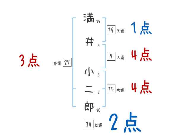 天運![]() | 満井小二郎さんの天運は19画の1つ星!優れた才能を持ちますが、協調性が足りないことも。周りの人と協力する事を意識しましょう。 家系が持つ宿命的な運勢を表します。祖先から受け継いだ苗字ですので自分の力が及びません。家柄を象徴します。 |